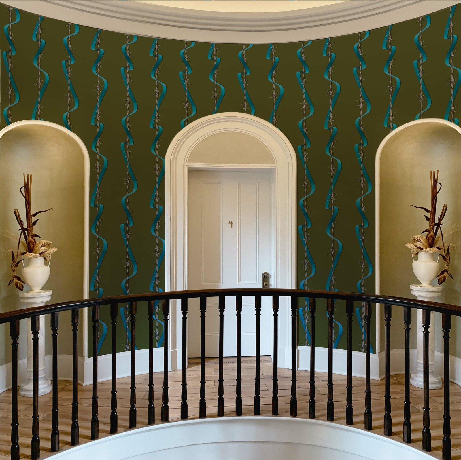 The wallpaper stages a constant visual tension — vertical barbed wires, sharp and metallic, intertwine with a thin, glossy silk ribbon that follows them without taming them. It is a parallel path between pain and tenderness, cruelty and protection.