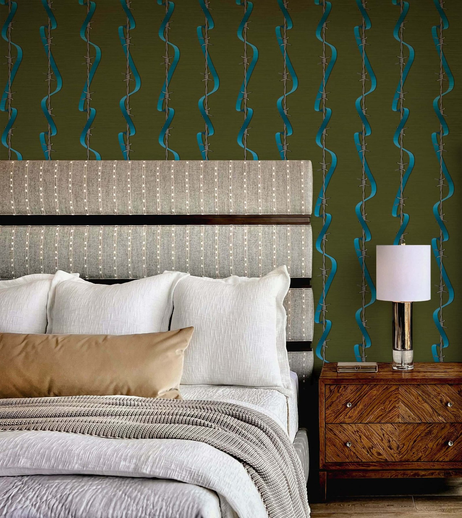 Wallpaper True Love isn’t Hearts and Flowers by Magnus Gjoen x MaVoix, featuring barbed wire and sky-blue ribbon on an olive-green background — a symbolic and powerful pattern.