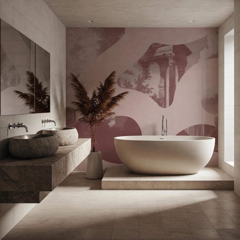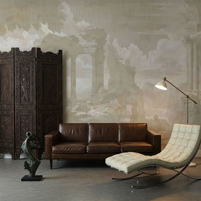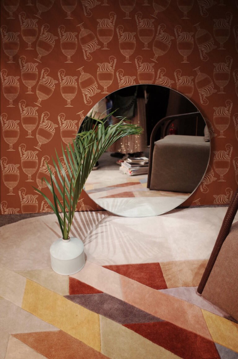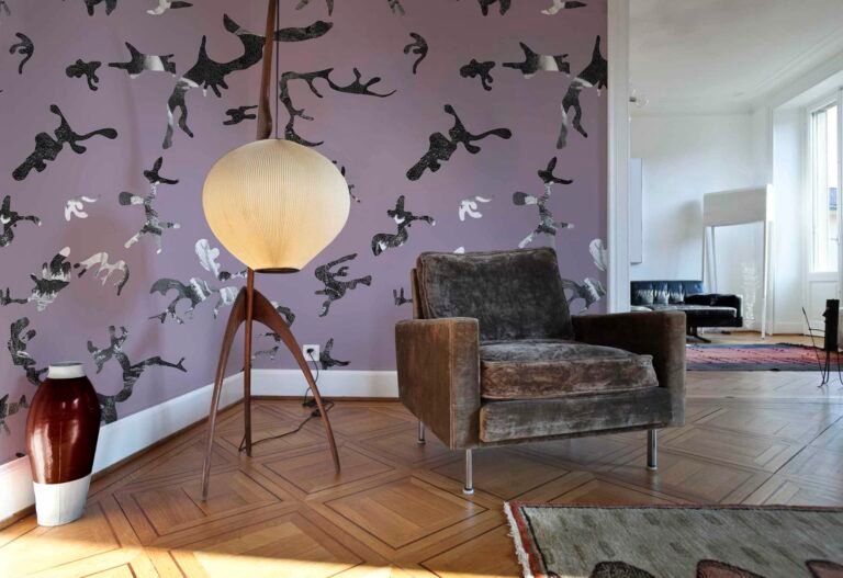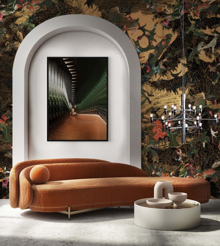 La carta da parati si compone come un camouflage contemporaneo, in cui sagome organiche sembrano fluttuare su uno sfondo compatto, mentre al loro interno si celano dettagli tratti dal repertorio artistico classico: figure umane, panneggi, scene, incisioni.