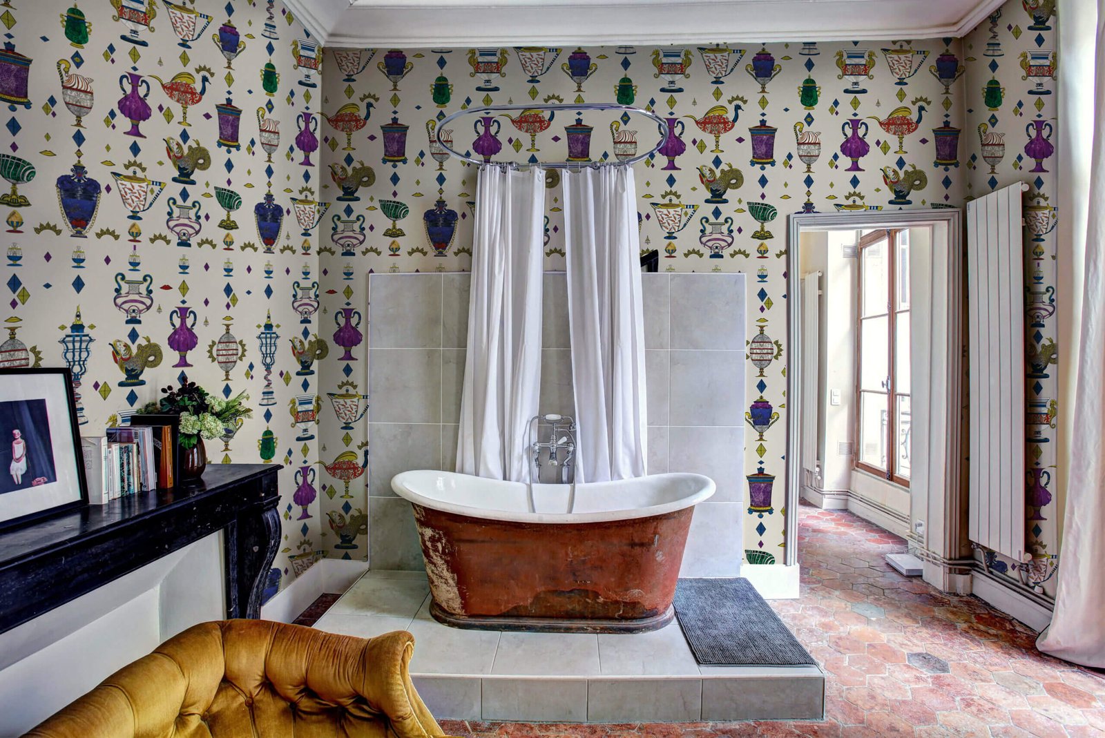 Le decorazioni, in lapis, malachite, ametista e oro brunito, risaltano con eleganza, come miniature esposte su pergamena. Il risultato è una carta da parati luminosa, aristocratica e rarefatta, perfetta per interni chiari, classici o contemporanei che cercano equilibrio tra decoro e leggibilità visiva.