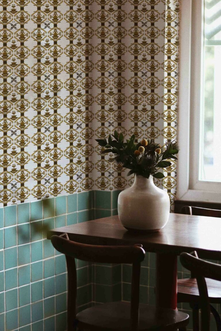Il fondo è una tonalità curry dorata, calda, speziata e luminosa, capace di trasformare la parete in una superficie viva, solare, intensa. I soggetti illustrati in bianco, leggeri e definiti, creano un contrasto visivo elegante ma vibrante. Il risultato è un equilibrio tra decorazione e narrazione, ideale per ambienti che cercano poesia, energia e raffinatezza visiva.