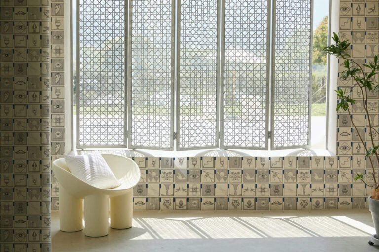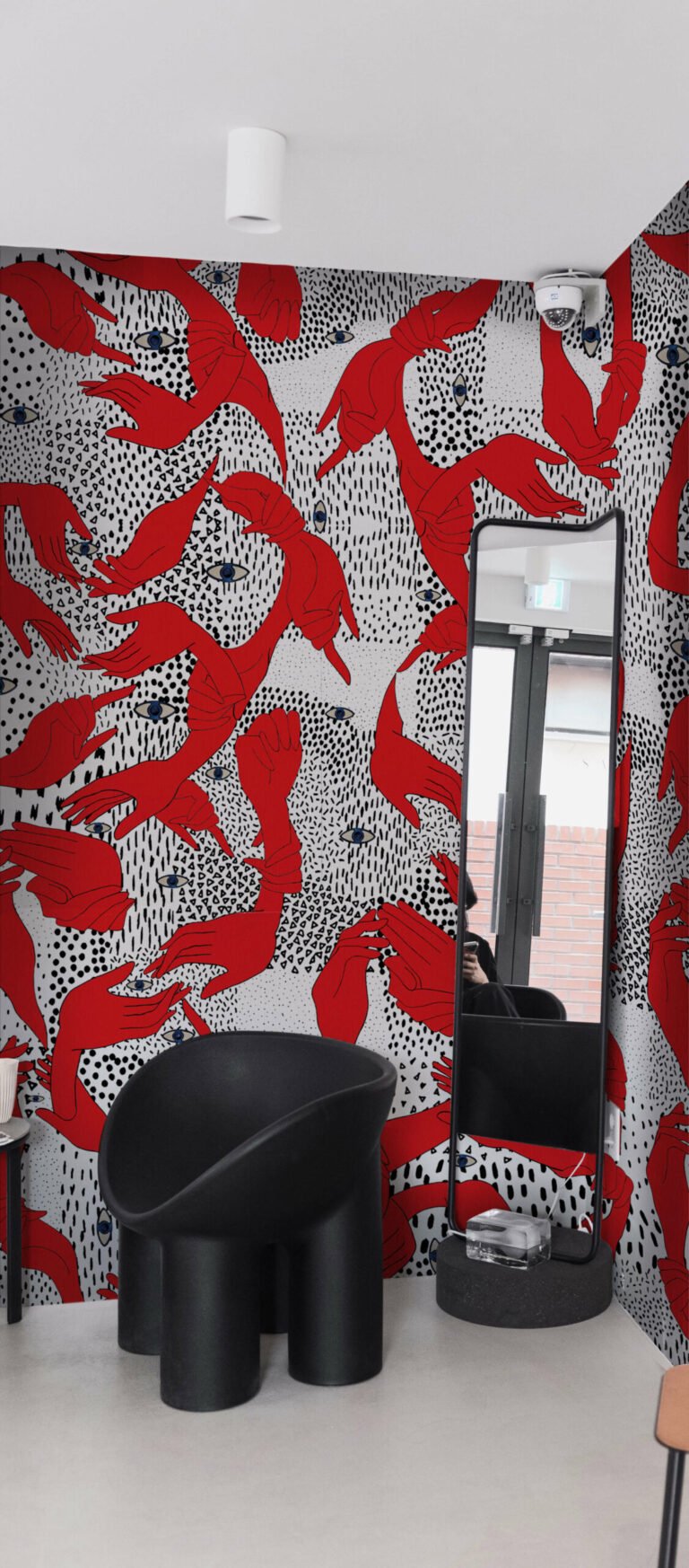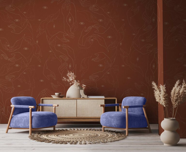 In questa variante Écru della carta da parati Uno, Nessuno, disegnata da Marika Tardio per MaVoix, l’equilibrio tra forma e assenza trova il suo spazio più contemplativo. Il pattern si riduce all’essenziale: un intreccio continuo di mani e occhi sospesi, tracciati solo in bianco latte, su uno sfondo ecru caldo, simile al colore del cotone grezzo, naturale, mai invadente.